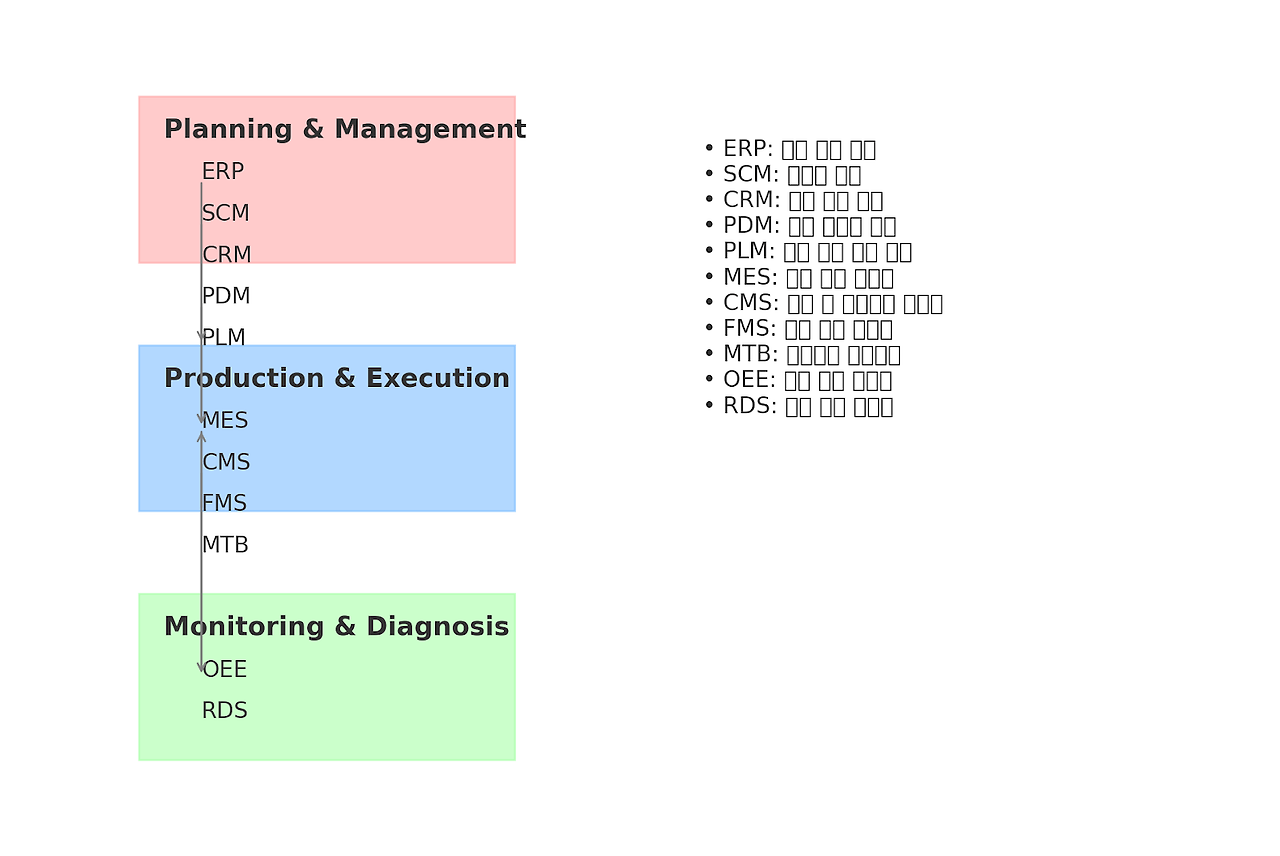 제조 공정의 전략적 목표 설정, 자원 배분, 그리고 전체적인 비즈니스 계획과 관련된 시스템들을 포함합니다.