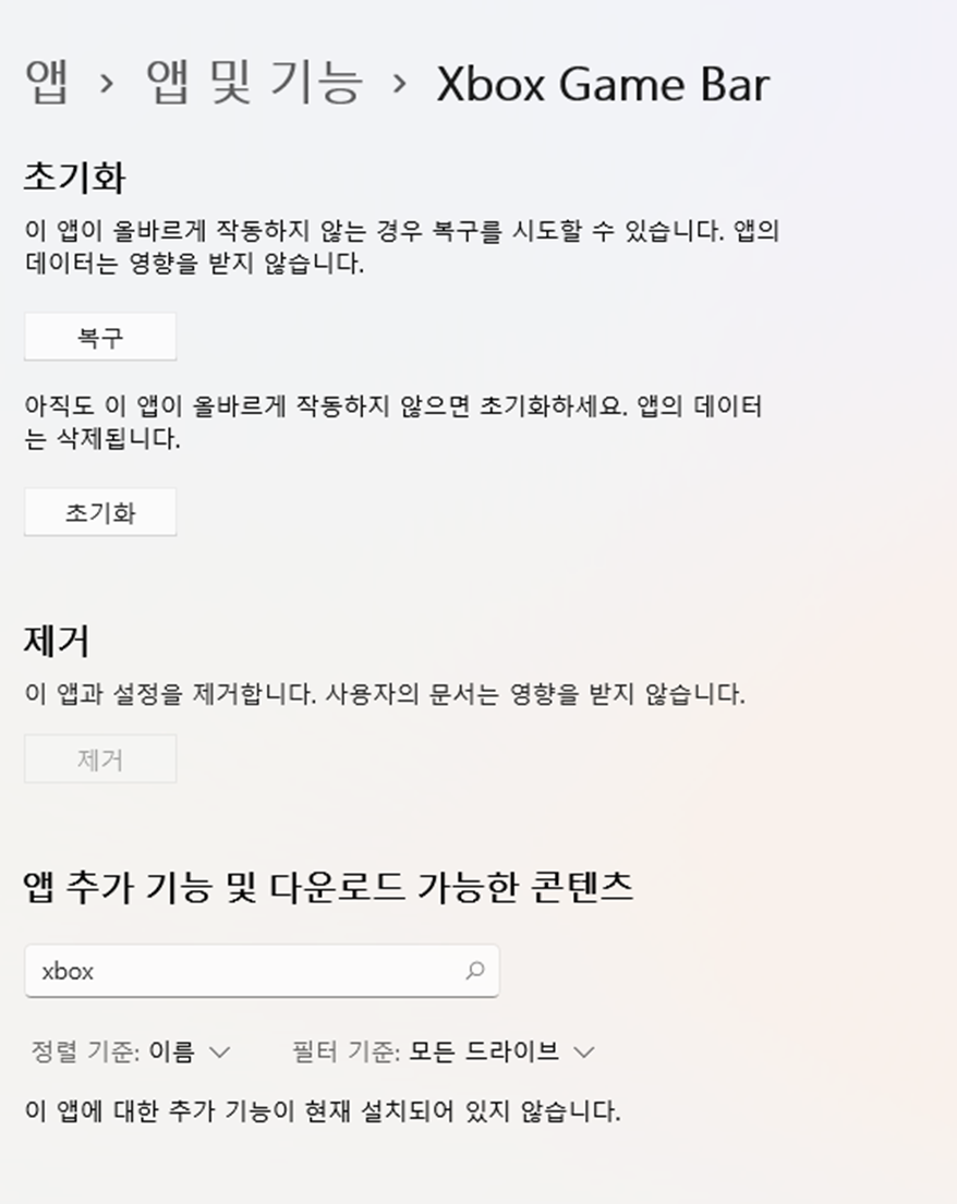 1. 설정 -> 앱 -> 앱 및 기능 -> 검색을 이용해서 'Xbox Game Bar 찾기